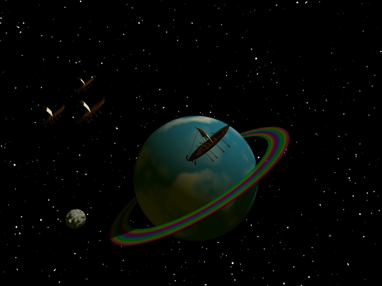 I originally did the planet, rings, and moon for Simple Photorealism using Persistence of Vision. When I wrote Silver sail and gold, above a dappled sea I added some Greek rowing ships.